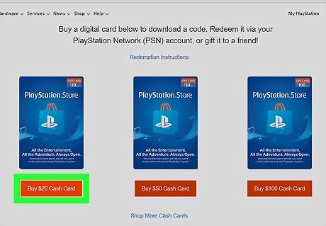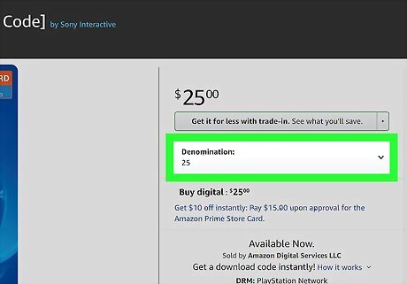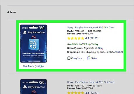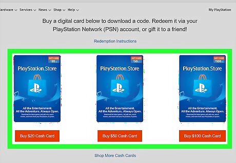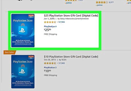Click the card with the value you want. PSN cards are blue and have an icon of the PlayStation "PS" logo on a shopping bag. If you don't see an option for the amount you want to put on the card, you'll be able to select a different denomination on the next page.