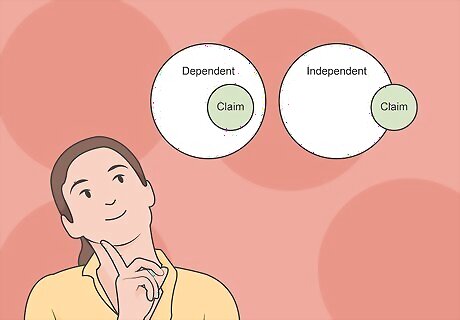 Determine whether the claim is dependent or independent. Generally, independent claims are more important than dependent claims. Dependent claims refer back to the independent claim mentioned and typically identify more limited activity that would still be considered an infringement of the independent claim. It might help to think of the independent claims as parent claims and the dependent claims as baby claims. If you infringe one of the baby claims, you've automatically infringed the parent claim as well.Tip: The independent claims are the most important part of a patent. If you read and understand nothing else about the patent, make sure you understand the independent claims.