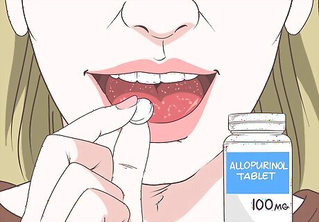 Take allopurinal if you have recurrent or severe symptoms. If you have frequent gout flare-ups, joint damage, or kidney stones, your doctor will prescribe a drug that reduces the uric acid in your blood. Of these medications, allopurinal is the most commonly prescribed. You’ll most likely start by taking 50 to 100 mg orally per day, then your doctor will gradually increase your dose to 200 to 300 mg. Side effects may include nausea, diarrhea, and headache. If side effects interfere with your quality of life, ask your doctor if it’s possible to try another medication for uric acid.Safety Tip: Even if you experience undesirable side effects, don’t stop taking a prescription medication without consulting your doctor. Additionally, take your medication as directed even if you don’t experience symptoms, as stopping could lead to a flare-up.