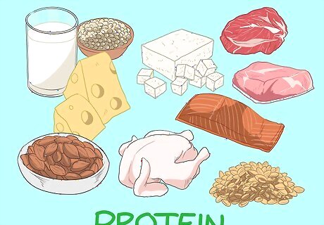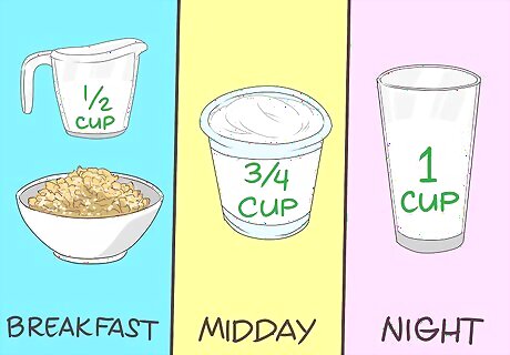 Include low-fat dairy products in your diet. Try to get 3 servings of dairy per day; just be sure to choose low-fat or skim products. A sample menu could be ⁄2 cup (120 mL) of milk with your breakfast cereal, ¾ cup (200 g) of yogurt as a midday snack, and a 1 cup (240 mL) glass of milk before bed. Dairy products may lower uric acid levels by helping your body flush the substances that form uric acid. If you’re dairy-free, you’ll need non-dairy alternatives to meet your daily calcium needs, but they may not have the same effect on uric acid levels as actual dairy.