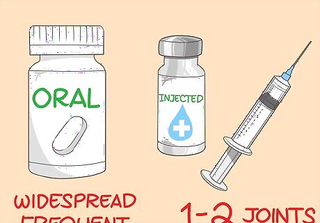 Talk to your doctor about oral or injected corticosteroids. Corticosteroids are generally only recommended for people who can’t take NSAIDs and colchicine, or if these medications are ineffective. If 1 or 2 of your joints are affected, your doctor will probably inject a corticosteroid directly into each one. For widespread or frequent flare-ups, you may need to take an oral corticosteroid. While you may experience discomfort at the injection site, side effects are usually minimal for injected corticosteroids. Systemic oral corticosteroids may cause side effects including weight gain, high blood sugar, and increased risk for infections.