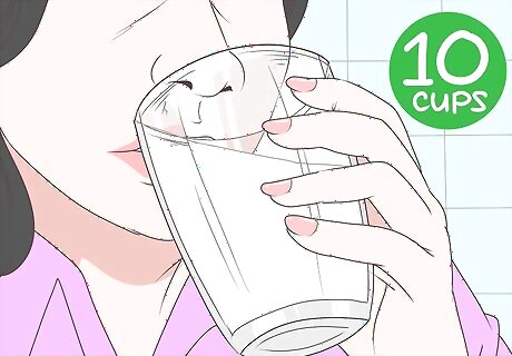 Drink at least 8 to 10 cups (1.9 to 2.4 L) of fluids per day. Staying hydrated helps your kidneys flush uric acid and other substances from your body. The exact amount you need depends on factors like age and activity level, but 8 to 10 cups (1.9 to 2.4 L) is a good rule of thumb. Remember to drink more liquids when it’s hot, during physical activity, and when you’re sweating a lot. Drinking 1 cup (240 mL) every 20 minutes during these periods should do the trick. Don’t wait to drink until you’re thirsty, as thirst means you’re started to get dehydrated. Instead, check your urine to gauge your hydration. If it’s dark yellow in color, you need to drink more fluids.