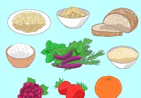 Eat more complex carbs, such as fruits, veggies, and whole grains. Complex carbs are an important part of a healthy diet, and are especially beneficial if you have high uric acid levels. Each day, try to eat about 3 cups (400 g) each of fruit and veggies and 2 to 5 servings of whole grains. Example whole grain servings include 1 slice of bread and ½ cup (75 to 120 g) of pasta, quinoa, oatmeal, or brown rice. Make sure your breads and pastas are labeled “whole grain,” as they’re healthier choices than refined products.