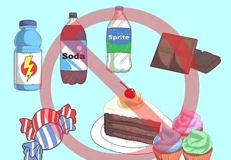 Limit your sugar intake. Manage your dietary intake by avoiding soft drinks and other sweetened beverages, and drink sports drinks sparingly. Do your best to stay away from candy, sweet pastries and desserts, and other sugary foods. Check the labels for cereals, condiments, and other items as well, and avoid products that contain added sugars. Purines are released as your body breaks down the type of sugar found in sweets and soft drinks. In turn, purines lead to spikes in uric acid levels and gout flare-ups.Tip: While fruit is an important part of your diet, you should only drink fruit juice in moderation. Additionally, choose low-sugar juices that do not contain added sweeteners. Drinking too much fruit juice could cause spikes in your sugar levels.