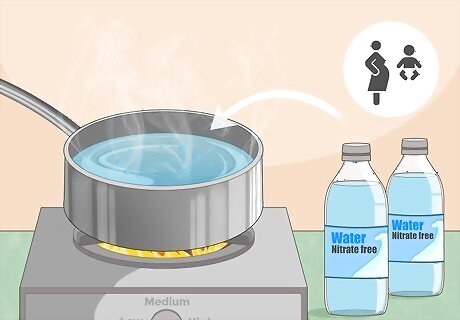 Use bottled drinking and cooking water for infants or pregnant people. There’s no clear evidence that high nitrate levels are a health risk for older children or adults. However, elevated nitrates are a clear danger for fetuses and infants under about 6 months of age. If you’re pregnant or are using water to mix formula for an infant, rely on bottled water if your home water supply has elevated nitrate levels. High nitrate levels can cause methemoglobinemia (sometimes called “blue baby syndrome”) in fetuses and infants. This condition essentially cuts off their oxygen supply from within and can be fatal, but thankfully it is reversible if treated promptly. Elevated nitrate levels are not transmitted through breast milk. To have your water tested for nitrates, contact a laboratory that has been certified by an appropriate government agency (such as the CDC or EPA in the U.S.). For reference, “high” nitrate levels can be defined variously as follows: 4 mg per kg of body weight per day; 45 mg per liter of water; 10 parts per million (ppm) of water.