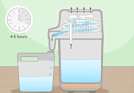 Distill nitrates from your water with a professional setup. While you can use low-tech methods to distill water in small amounts at home, you’ll need a professional system for large-scale water needs. Distillation involves boiling the water to kill pathogens and leave behind nitrates and other materials, then collecting, cooling, and condensing the steam into usable water. Unlike simply boiling water, in which case the nitrate-free steam is wasted, distillation collects this steam and turns it into nitrate-free water. Distillation is a slow process—it can take a home unit 4-5 hours to produce 1 US gal (3.8 l) of water. It also uses a great deal of energy and adds heat to your home.