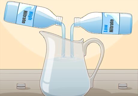 Dilute high-nitrate water with low-nitrate water for drinking and cooking. If relying strictly on bottled water for an infant or pregnant person is impractical or too expensive, you can instead cut down on the nitrate concentration by mixing your water supplies. By mixing high-nitrate and low-nitrate water, you can reduce the overall nitrate concentration to acceptable levels. For example, say your goal is to get below 10 ppm and your well water is at 19 ppm. If you mix together equal amounts of well water and distilled water (which will have practically zero nitrates), you'll end up below 10 ppm.