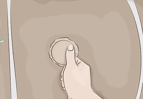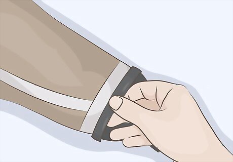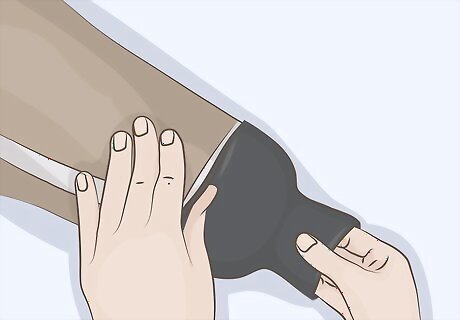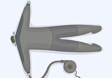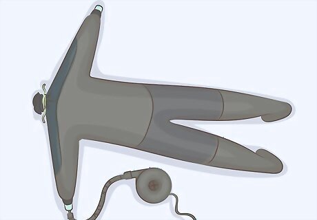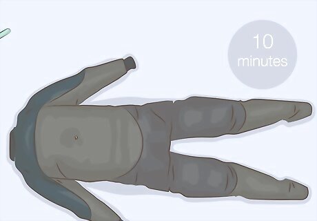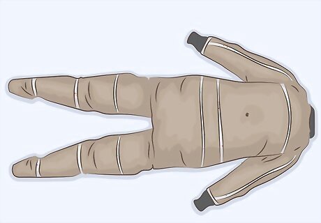 Seal the drysuit and inflate it with a pump. Use 2 plastic cups to seal the sleeves of the suit, but poke a hole that fits the end of your pump into 1 of the cups. Zip up the suit zipper and tie off the neck with a bungee cord or string. Place the end of the hand pump into the hole in the cup and inflate the suit. Leave the pump in the opening in the cup so you can add more air as the suit deflates. Be careful not to overinflate the suit.