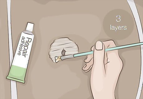 Cover the tear with 3 layers of repair adhesive. Use a small brush to apply the first layer of the repair adhesive over the surface of the tear. Allow the tear to fully dry for about 5-10 minutes, then apply another layer. Continue applying the additional layers of adhesive, allowing the previous layer to fully dry first. Make sure each layer is thin and even so there aren’t any bumps or ridges in the adhesive. You can find repair adhesive at diving supply shops and online. Popular brands include Gear Aid Aquaseal, G-Dive G-Glue, and Aquaseal Wetsuit Repair.Warning: The noxious fumes of the repair adhesive can make you feel ill or dizzy. Work in a well-ventilated area or wear a face mask when you’re applying it to the drysuit.