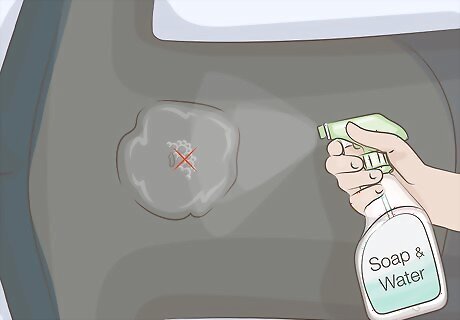 Spray a solution of soap and water over the repaired areas and look for bubbles. Fill a spray bottle with warm water and add a few drops of dish soap into it. Shake the bottle well to combine the solution. Spray the area above the tear and check for air bubbles. If there aren’t any bubbles, then the suit is sealed. If there are bubbles that from, you’ll need to dry the suit off and apply more repair adhesive to the patch.