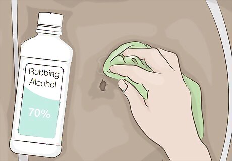 Clean around the tear with rubbing alcohol and allow it to dry. Take a clean cloth and apply rubbing alcohol to it. Wipe around the area of the tear to remove any salt, dirt, sand, or any other contaminants from the material. Then, leave the material to air dry for about 10 minutes. The surface of the drysuit must be clean in order for the adhesive to stick to it and form a tight seal.