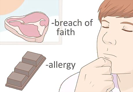 Face up to your beliefs or health needs. When your naughty indulgences breach your faith-based or other beliefs, or when eating the food leaves you sick, the issue is broader than simply concentrating on your weight or future health. In the case of breaching your faith-based beliefs, speak to your faith mentor, priest, minister, rabbi and seek solutions to the situation. He or she will likely have some good advice for you, since food cravings butting up against faith-based diets are common. If you're following a particularly strict diet like vegetarian, vegan, fruitarian, raw food, etc., and you're eating food that doesn't align with your dietary and wider ethical beliefs, it's time for a rethink about what you're doing and whether the choice you've made is working for you.
