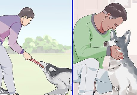 Show affection to the new dog. If the dog you received as a gift is relaxed and comfortable being touched, make a point of petting it often. Dogs love being rubbed behind the ears and patted on the head. Some dogs also enjoy rolling over and getting their belly rubbed. These actions can help you build a bond with the dog you received as a gift. You could also: Play with your dog Offer treats to your dog Give your dog a chew toy Give your dog a KONG toy that's filled with treats Get your dog a dog bone Tell your dog, “I love you, [dog’s name].”