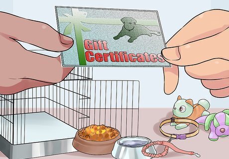 Give an adoption kit. Instead of making a pet selection yourself and gifting it to someone, make a gift of dog paraphernalia like a dog bed, collar, leash, and dog bones. This will alert the recipient to the fact that you want to give the person a dog as a gift. After they receive this dog paraphernalia, you can travel with them to your local animal shelter and move forward with the adoption process. This will give the person you’re gifting the dog to time to decide what sort of dog they want. Along with the adoption kit, provide a gift certificate from your local pet shelter in an amount close to the expected cost of the dog the person you’re giving to will want. You might also choose to produce your own “Pet Promise Certificate” using Petfinder’s online template.