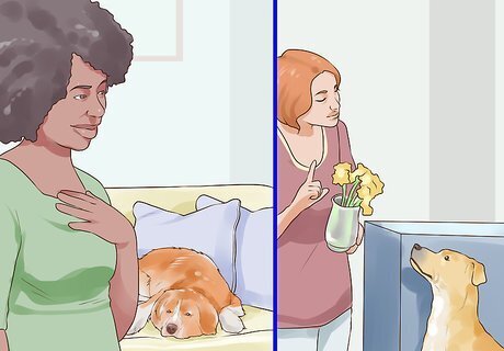 Get to know the dog’s body language. Dogs send identifiable signals when they feel threatened, aggressive, or sad. For instance, if the dog lowers its head, bares its teeth, and has its hackles raised, it feels threatened and might attack. If it’s walking around with its tail between its legs, it might feel scared or ashamed. Encourage your family to respond appropriately to the dog you got as a pet. For instance, if the dog seems scared or threatened, instruct family members to speak in a calm, soothing way to it.