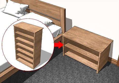 Put a bookshelf on its side to make an accent piece with storage space. First, remove the shelves from the bookcase and place it on its side. Then, add a piece of wood to the middle of the bookcase by attaching it to the sides with screws and a screwdriver. Finally, paint this piece of wood to match the rest of the bookcase. If you want to maximize the amount of vertical storage space in this piece, simply refrain from adding the piece of wood to the middle of it. You can also cut the bookcase into 2 pieces and reuse the top piece as a nightstand.