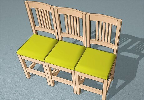 Nail multiple chairs together and add cushioning to create a bench. Take 2 or 3 small wooden chairs and set them next to each other. Then, lay a piece of wood down on top of the chairs and use screws to attach the board to the chairs underneath. Finally, add a fresh coat of paint to the chairs and the wood and place a cushion on top of the board. Note that your piece of wood should be cut down to the length of the 3 chairs combined before you attach it to them.