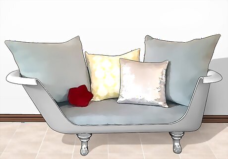 Cut out the side of an old bathtub to create a cozy couch tub. Use a jigsaw with a fiberglass blade to cut off 1 side of the tub. Then, use sandpaper or a grindstone to smooth out the edges where you made your cut. Finally, add cushioning and pillows to the interior of the tub to create a comfy couch. When you cut the side of the tub, only cut off the straight section of the siding. Leave the curved corners of the tub in place. Your new couch tub can be used equally well either indoors or outdoors!