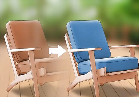 Give upholstered furniture a new layer of upholstery. Some pieces of furniture have upholstery that can be removed and replaced relatively easily. Take the upholstery off an old couch or cushioned chair and install a new cover to refresh that furniture’s look. If you want your furniture to feel as new as it looks, replace any padding or cushion that was underneath the old upholstery as well. You can also use slipcovers instead of new upholstery to brighten old furniture. If an old sofa or chair has become an eyesore due to stains, tears, or an outdated pattern, consider slipcovers for an inexpensive update.
