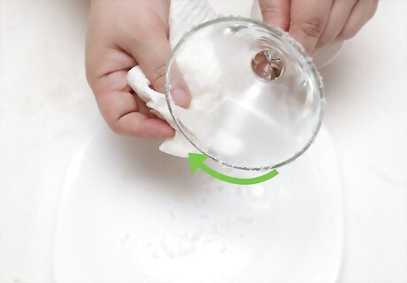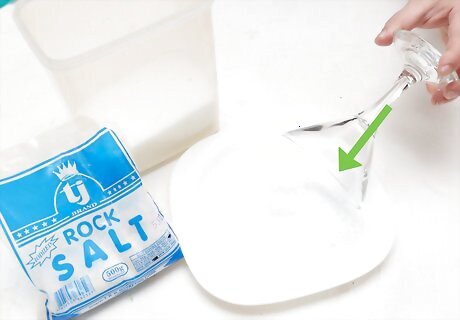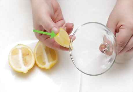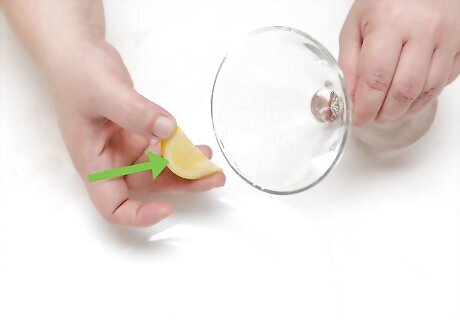 Use fruit or juice. Cut up fruit and rub it along the rim of the glass. Or, dip the glass in a shallow dish of juice. Use juice that is similar to an ingredient in your cocktail. For example, rub a wedge or lime or lemon around the rim.
