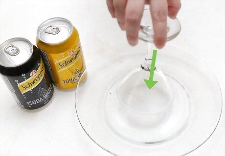 Dip the glass in water or soda. Use regular water or tonic water. Alternately, sugary soda leaves a sticky residue that can help your topping to stick. Look for light-colored soda so that it adds just the right amount of taste. Try a lemon-lime soda with a slice of lemon or lime as a garnishment.