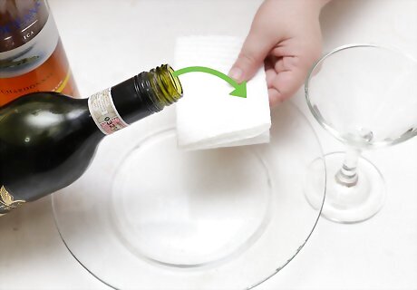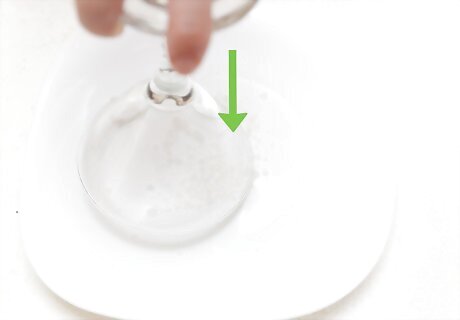 Clean off the excess topping. Shake the glass over the topping dish so that any topping which isn’t well adhered will fall off. Wet a napkin or paper towel. Wipe off any topping that strayed outside the line and looks messy. Set the glass down, upright, on a hard surface. Pinch the stem with one hand. With your other hand, press the moistened paper against the glass where the rimmed topping ends. Twist the glass by the stem, 360 degrees, to wipe off the excess topping in one clean line.