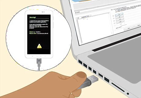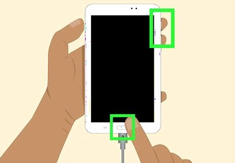 Put the tablet into Download Mode. Follow these steps to do so: Turn off your tablet by pressing and holding the Power button. Press and hold the Volume Down + Home + Power buttons on your tablet. After about 2-3 seconds, lift your fingers from these buttons. Press the Volume Up key when you see the warning screen with an exclamation point. The tablet is now in Download Mode.