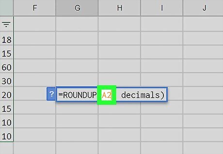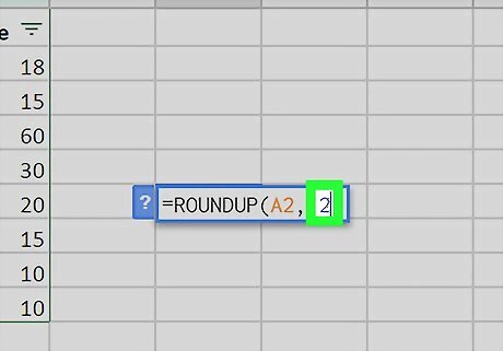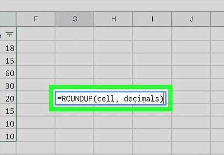 Type =ROUNDUP(cell, decimals) into the empty cell. This formula allows you to pull numeric data from another cell, and round it up to any number of decimal places.