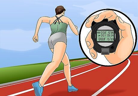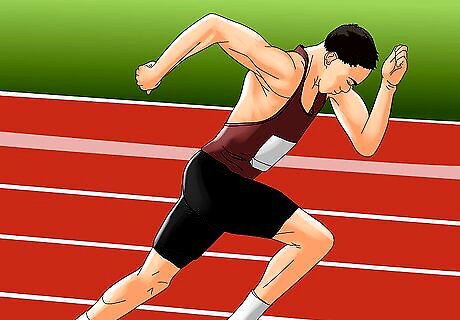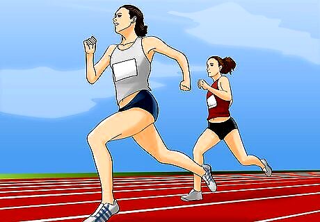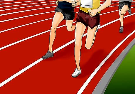 Moderate your pace for the first lap. Off the blocks, you and the other runners will likely be at a slightly faster pace than normal. This is a result of adrenaline and is completely normal, though you should be careful not to overexert yourself. Doing so can create difficulty for you later in the race when your energy starts flagging. Though you don't want to be caught up in the adrenaline rush and burn yourself out on the first lap, you should also be careful that the pack does not pull too far ahead of you. Your first 400 m, which is also your first lap, should be no faster than four or five seconds under your target splits. Your split time is your total time for any point during your run. In a mile race your split times might look like 1:05, 2:10, 3:15 and 4:20 for each lap. Split times gauge your time according to specified waypoints (turns, miles, laps), as though your run had ended there. Remember to stay in lane one whenever possible. Usain Bolt Usain Bolt, Olympic Sprinter Know your strengths. "There are better starters than me, but I’m a strong finisher."