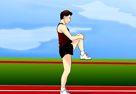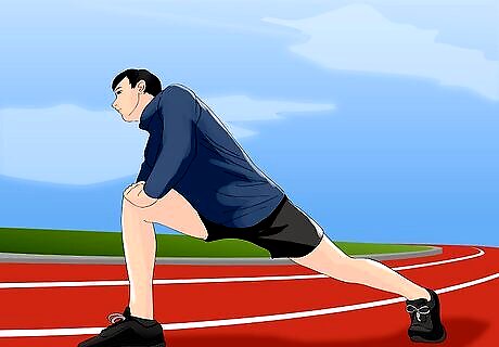 Use dynamic stretches. Dynamic stretches are warm up moves that also limber up your body. These can be added to your warm up laps, or you can dynamically stretch after your lap work. There are many dynamic stretches you might use when warming up, but a few to consider include: Front lunges Reverse lunges High steppers (also called high knees), where you raise your knees as high as possible while jogging or at a light run. Butt kickers, where you kick your feet toward your butt each time one passes behind you.