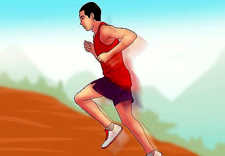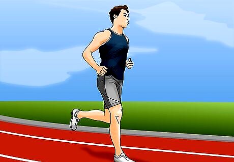 Run some warm up laps. You'll want to run at least a mile to prepare your body for the real race. Another strategy you might use is to jog moderately for a mile or two. You can then follow your jog with a final mile of form work. Keep your breathing even and controlled throughout your warmup. You'll want your arms to drive forward without deviating to the left or the right. Each arm should be parallel to the track. Your head should be relaxed with a slightly lowered chin, but your eyes should be up and alert. Shoulders should be back which should thrust your chest into a slightly taller position. When running, your chest should be tall, but not overextended in front of you.