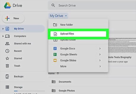 Click Upload Files. This should be the second option in the drop-down menu. You might see this button in the upper left corner of your screen instead.