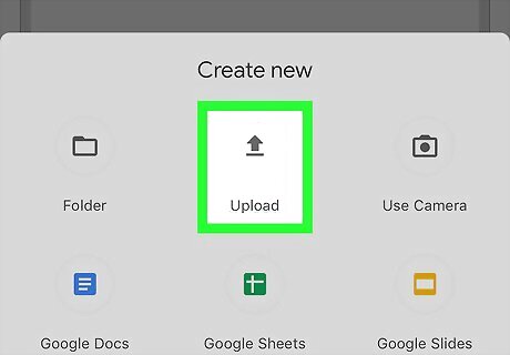 Tap Upload. This button also has an upward pointing arrow with a line underneath it. A list of the files on your phone will appear.