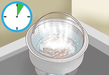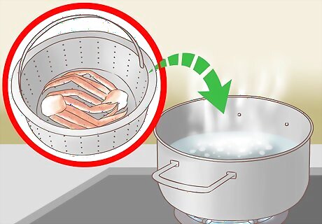 Arrange your crab legs in the steamer basket. Place the steamer basket over the boiling water.