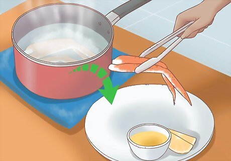 Remove the crab legs from the boiling water using tongs. Place the crab legs onto serving plates with lemon wedges and a dish of melted butter.