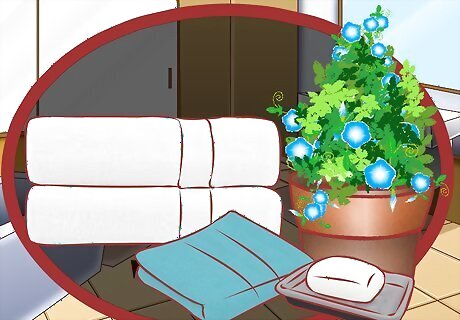 Buy some crisp new towels and face cloths, a new soap dish, a few fragrant soaps and a flowering pot plant. A white towel works well—it's nice to layer a hand towel overtop. If the bathroom is lacking in color and personality, use the towel as well as a little piece of artwork to liven up the space.