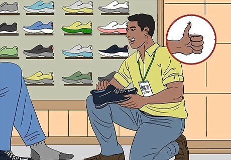 Have the customer sit to try on the shoes. Offer to measure both of their feet to make sure their size is 100% accurate. This will vary by brand a bit, too. While they are sitting ask them what the shoes are going to be used for to help you identify their needs and improve their experience. Have your customer try on both shoes and walk around in them. If the shoes slide up and down on their feet or pinch their toes, offer to grab a different size or style. Run to storage and bring back the shoes requested, possibly also bringing back pairs that are slightly bigger or smaller, just in case (especially if they said sometimes they go back and forth between two sizes).
