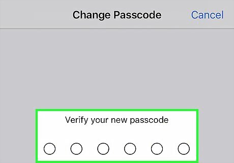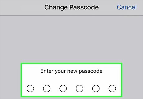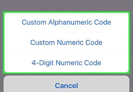 Tap a passcode option. You can choose from four types of passcodes: Tap Custom Alphanumeric Code to use a passcode that contains numbers and/or letters and is of a length that you determine. Tap Custom Numeric Code to use a numbers-only passcode that's of a length that you determine. Tap 6-Digit Numeric Code to use a numbers-only passcode that contains six characters. Tap 4-Digit Numeric Code to use a numbers-only passcode that contains four characters.