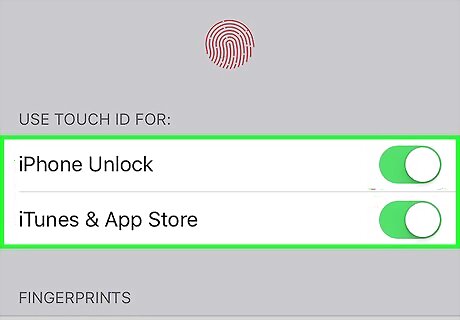 Choose how to use Touch ID. The controls in the "USE TOUCH ID FOR:" section at the top of the screen allow you to enable or disable Touch ID for these functions by sliding them "On" (green) or "Off" (white): iPhone Unlock to unlock your phone from the lock screen; Apple Pay to use Apple Pay without entering a passcode; and iTunes & App Store to make purchases without entering a passcode.
