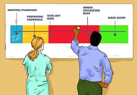 Make a timeline of tasks for the fundraiser. Once you have assembled your fundraising team and you have identified the end goal for the fundraiser, you should make a timeline of tasks. Start with the most essential tasks first and set a deadline for them to get done. You should work through the tasks, prioritizing the most important tasks first, so that the team does not get overwhelmed by the fundraiser. Pace yourself and do one task at a time. Another option is to assign certain tasks to individuals on the team. Avoid taking on all the tasks yourself, as you are sure to get overwhelmed and stressed. Instead, try to assign the tasks equally among the team, focusing on tasks that would be suited to the roles on the team. You should attach deadlines to the tasks and check in periodically with each team member so they get done.
