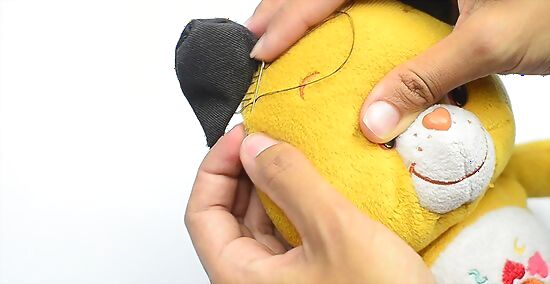 Sew the ladder stitch across each straight edge. To seal the ears closed, thread a needle and hold the straight edges of an ear together. Insert the needle through the gap at 1 end and pull it up through the fabric so the knot is hidden. Then, make a straight stitch that's about ⁄4 inch (0.64 cm) long at the top edge. Insert the needle directly below the stitch on the opposite edge and sew another straight stitch. Keep sewing back and forth between the edges, pulling as you go. This makes the join invisible.Variation: If you want your teddy to have fluffy ears, push a few cotton ball-sized pieces of stuffing into each ear before you stitch them shut. The ladder stitch is also called the invisible stitch, which makes it great for working across the straight edges of the ears. Use thread that matches the color of the teddy bear.