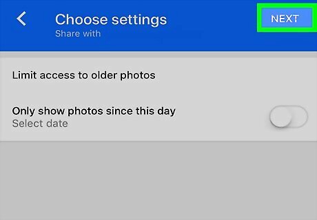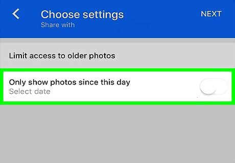 Select which photos you wish to share. Tap All photos to share every photo in your library, or Photos of specific people to select people you’ve tagged. To share only photos starting after a certain date, slide “Only show photos since this day” to Android 7 Switch On and then select the start date.
