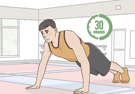 Exercise for 30 minutes every day. Daily exercise will help you stay healthy and can boost your mood. Choose an exercise that’s fun and easy for you to do at home. Here are some ways to exercise in your home if you decide not to go outside: Do a video workout online. You can find several free options, especially on YouTube. Perform calisthenics, such as squats, lunges, and jumping jacks. Do yoga. Use your space for dancing or pacing to music. Climb up and down the stairs if you have them.