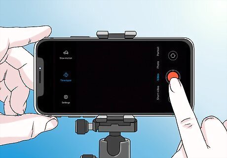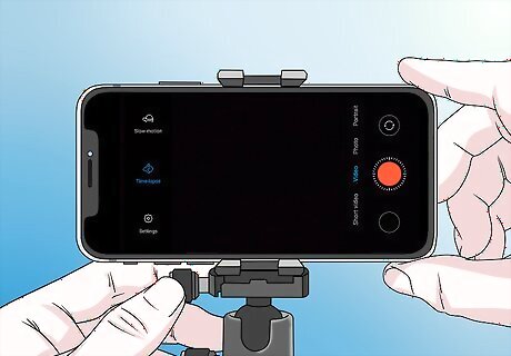 Set your phone in a stable place so it won't move while you record. A tripod with a phone mount is the ideal stabilizer for your phone. Prop your phone up against something that won't move if you don't have a phone tripod. If you are outside, keep in mind wind and other factors that could move your phone during recording. Make sure you have a full battery if you plan on shooting for a long time so your phone doesn't die in the middle of your time lapse!