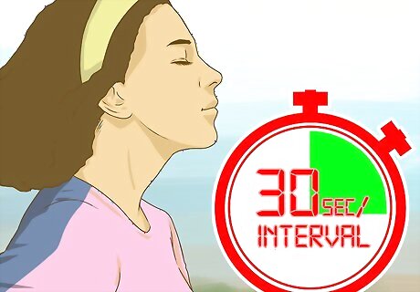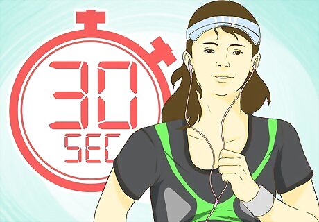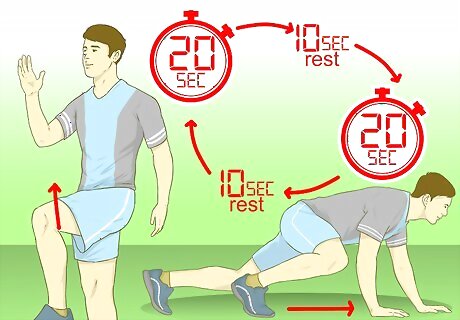 Jog or walk in place in between strength-training exercises. Whether you're doing HIIT specifically or simply adding cardio intervals to your regular strength-training regimen, try to avoid coming to a complete stand-still during your rest periods. Doing lower-intensity cardio during rest periods is part of what makes interval training more intense and allows you to decrease the total amount of time you work out. For example, you might do a strength-training exercise such as power squats or mountain climbers for 45 seconds, then jog or walk for a 30-second rest period. Then you would move immediately into another strength-training exercise.