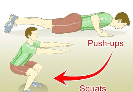 Do an upper-body exercise followed by a lower-body exercise. A superset is based on the idea of working one group of muscles and then immediately working another group of muscles. You can cut your workout time in half if you successfully incorporate supersets. For example, you might start with push-ups and immediately do a set of squats. If you wanted to lead with lower-body exercises, you might start with lunges and move directly into shoulder presses. Typically, you must rest between sets to give your muscles time to recover. However, rest between sets isn't necessary with supersets because you're working different muscle groups. Try to combine exercises that overlap as little as possible. Standing exercises will work your legs and core as well as your upper body, so they are less effective in supersets. You may benefit from the advice of a certified trainer when you're first developing a superset routine. They can make sure you're doing all the exercises with correct form and not unduly harming your performance or increasing your risk of injury.