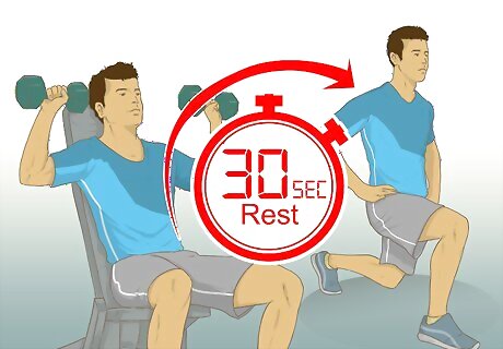 Take a brief rest between supersets. While the point of supersets is that you don't rest between sets, you still should take a brief rest of between 30 and 45 seconds between supersets before moving on to the next one. During your rest period, try to stay moving – even if it's simply walking in place.