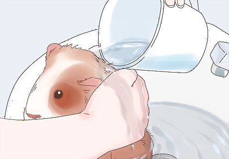 Rinse your guinea pig with water. Once your guinea pig is clean, begin pouring clean, warm water over its entire coat. Use a cup to pour the water over its coat. Rinse your guinea pig until all of the soap and residue are completely removed.