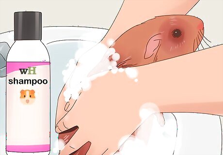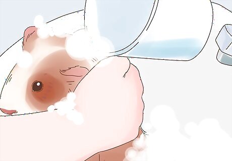 Apply a specially formulated guinea pig shampoo. Squeeze a pea-size amount of shampoo onto your fingers. Gently massage the shampoo into your guinea pig’s coat until thick lather forms. Make sure to shampoo its entire coat, excluding its head and face.