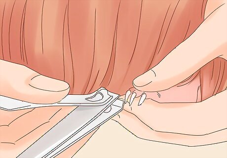 Clip its nails with a human nail clipper. Hold your guinea pig with one hand by placing your pointer finger between its front legs and under its chin. Clip the very tip of each nail. Only clip the very tip to avoid clipping the quick. Give your guinea pig a treat to distract it while you are clipping its nails. Keep a styptic pencil nearby just in case you clip the quick. Press the pencil against the nail to stop any bleeding. If you are unsure where the quick starts, shine a flashlight underneath its nails to identify the quick or take your guinea pig to the vet to have its nails trimmed.